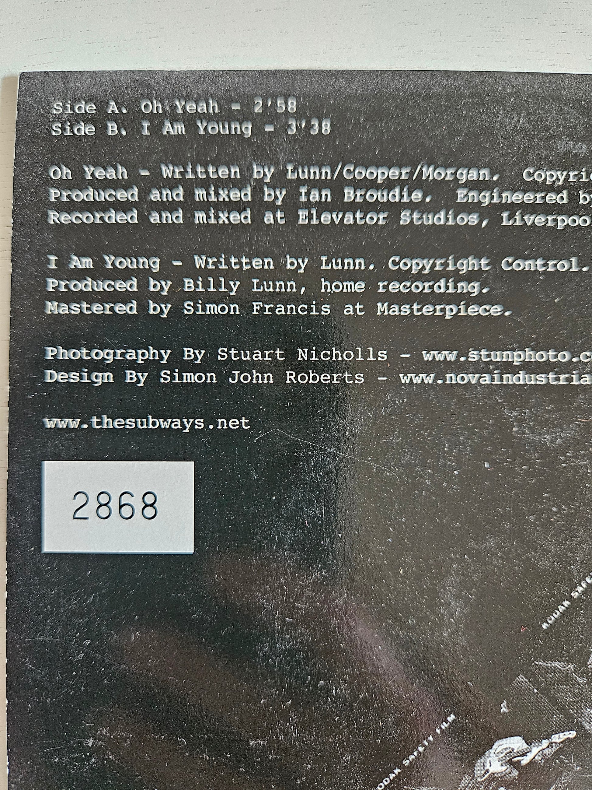 This fresh 7" vinyl from The Subways features the catchy "Oh Yeah" on Side A and the spirited "I Am Young" on Side B. Unplayed and ready to spin, it's a perfect treat for those who love raw, energetic rock vibes with a playful twist. Add a dash of youthful energy to your collection! Limited Edition number 2868.